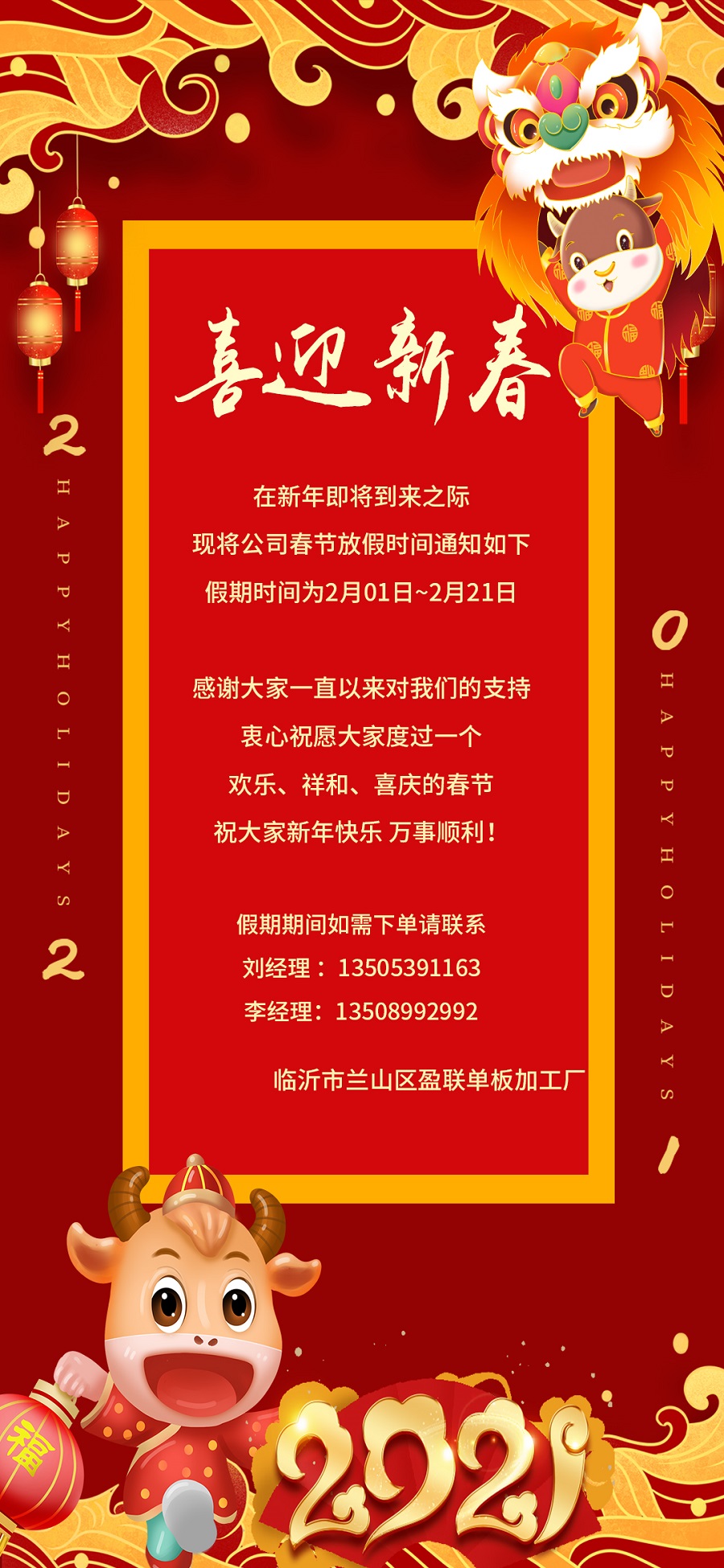 衷心感谢您过去一年的支持与信任,也衷心感谢盈联单板加工厂全体家人这一年的辛勤付出。春节来临之际,公司2021年春节放假安排如下: